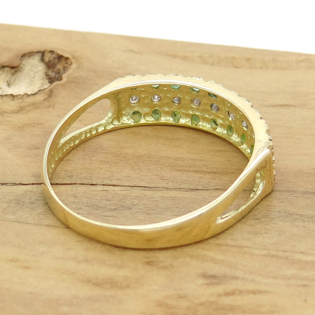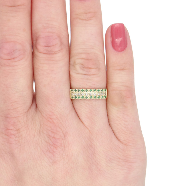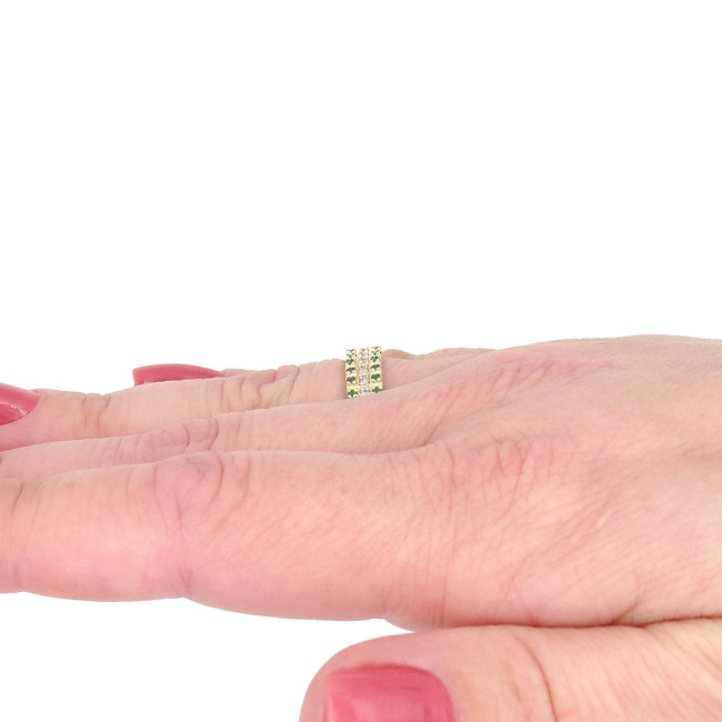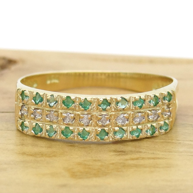 Meia Aliança Tripla com 20 Esmeraldas e 10 Diamantes, em Ouro Amarelo 18 Kilates