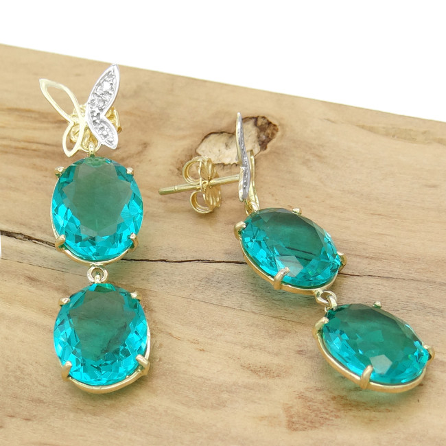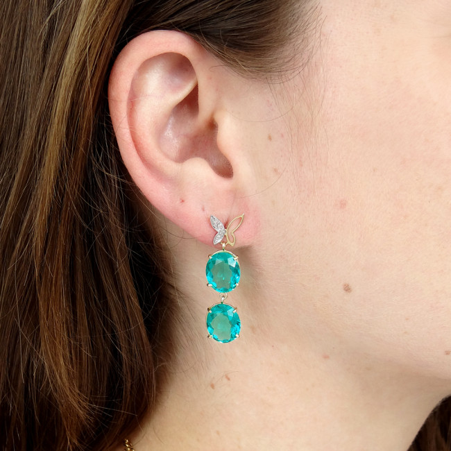 Par de Brincos Borboletas com 4 diamantes e Cristais de Turmalina Paraíba, em Ouro Amarelo 18 Kilates