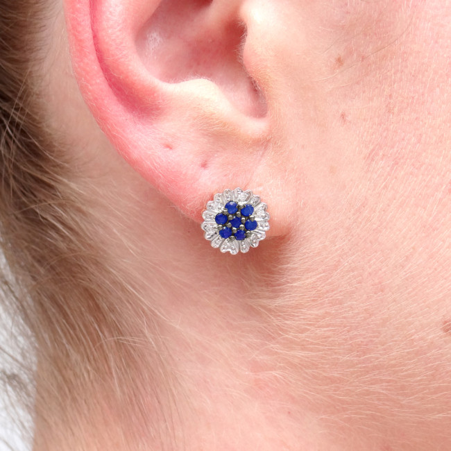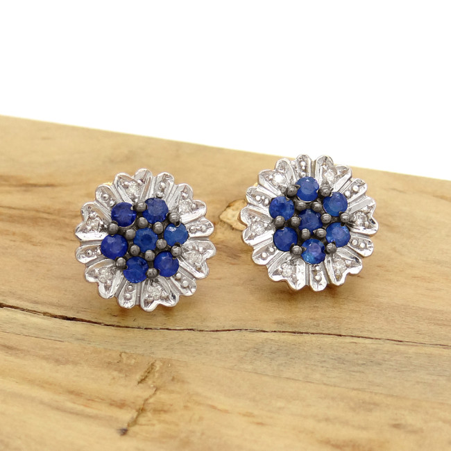 Par de Brincos Chuveiro com Safiras e Diamantes, em Ouro Amarelo 18 Kilates