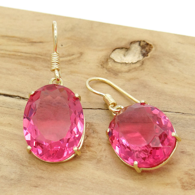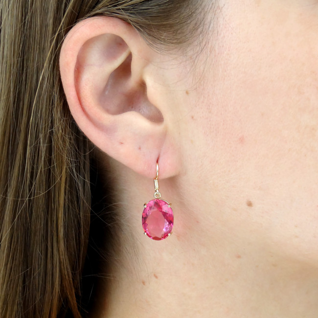 Par de Brincos com Cristal de Rubelita Oval, em Ouro Amarelo 18 Kilates