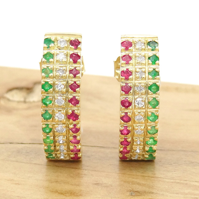 Par de Brincos Triplo com 20 Esmeraldas, 20 Diamantes e 20 Rubis, em Ouro Amarelo 18 Kilates