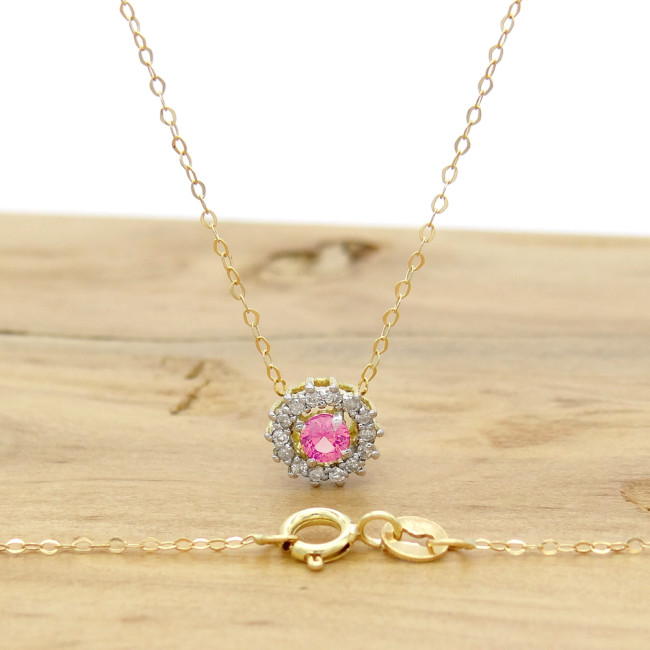 Pingente com Safira Rosa Natural de 15 pontos e 14 Diamantes, em Ouro Amarelo 18 Kilates