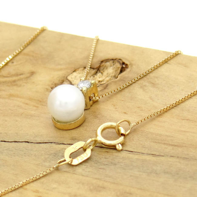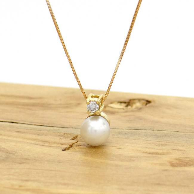 Pingente Pérola de 6 mm com Diamante de 5 Pontos, em Ouro Amarelo 18 Kilates