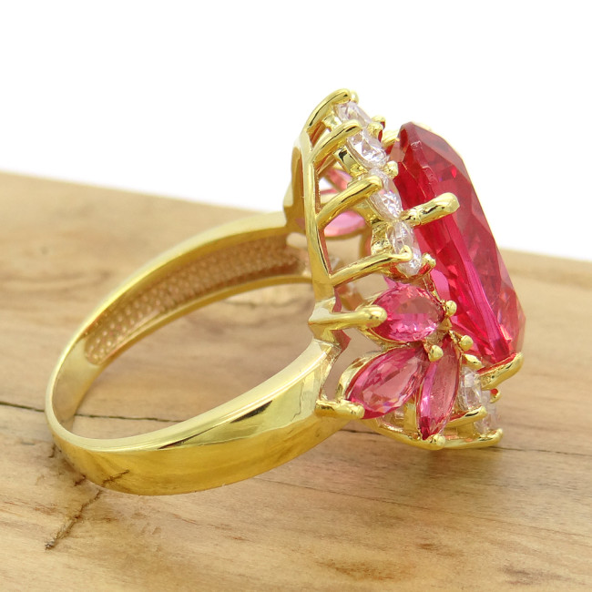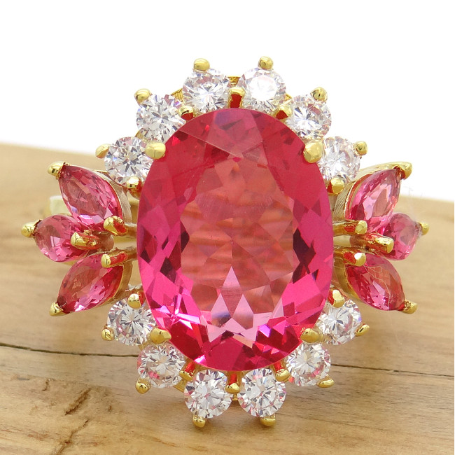 Anel com Cristais de Rubelita e Zircônias, em Prata 925 Folheado a Ouro
