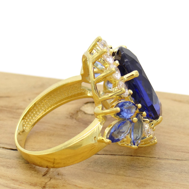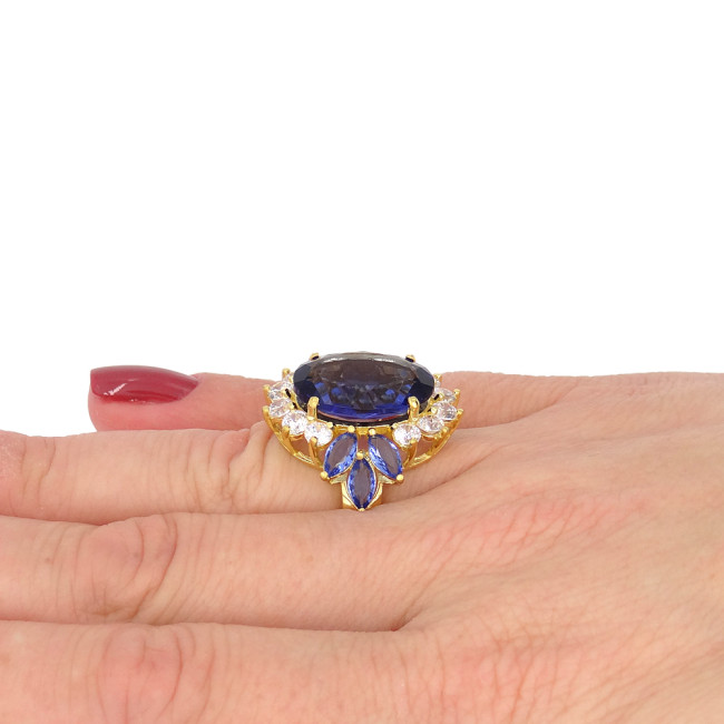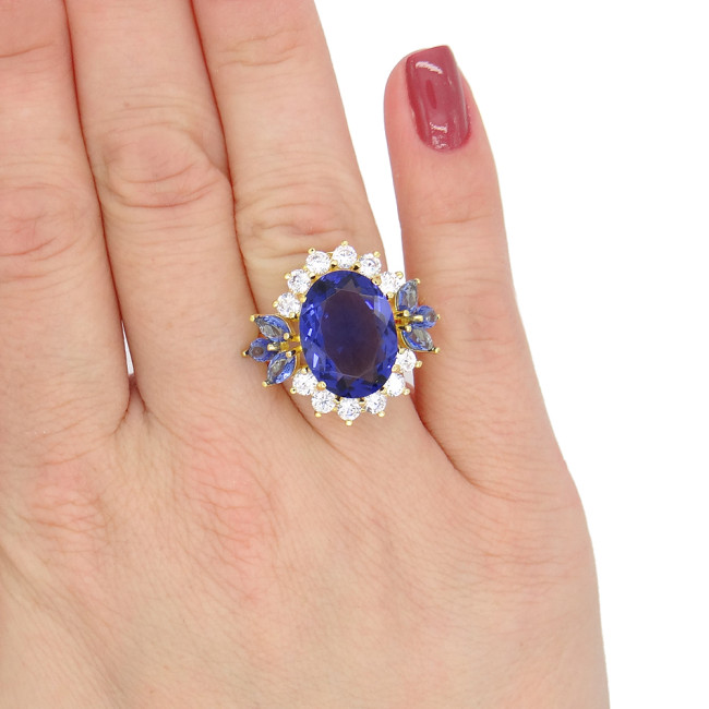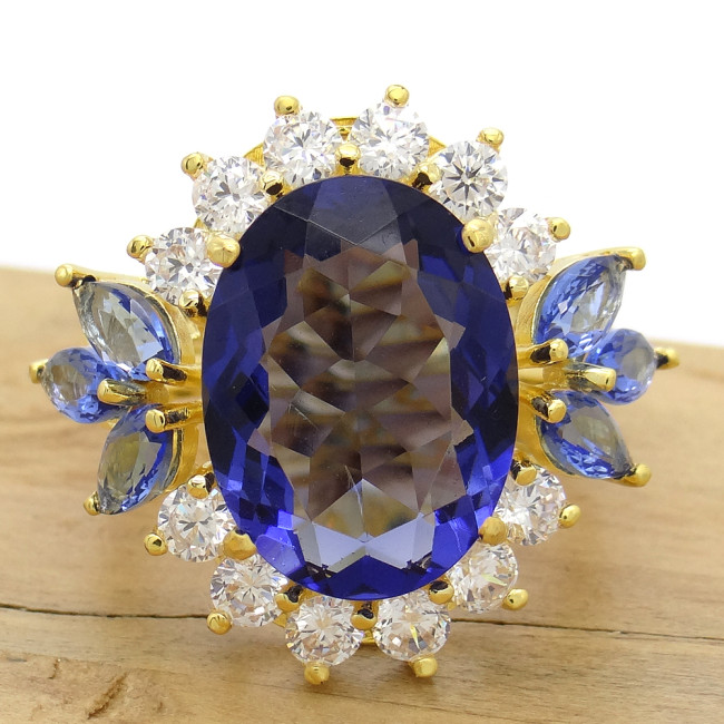 Anel com Cristais de Tanzanita e Zircônias, em Prata 925 Folheado a Ouro