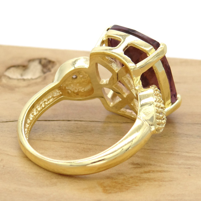 Anel com Diamantes e Cristal Ametista, em Prata 925 Folheado a Ouro
