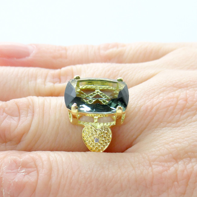 Anel com Diamantes e Cristal Prasiolita, em Prata 925 Folheado a Ouro