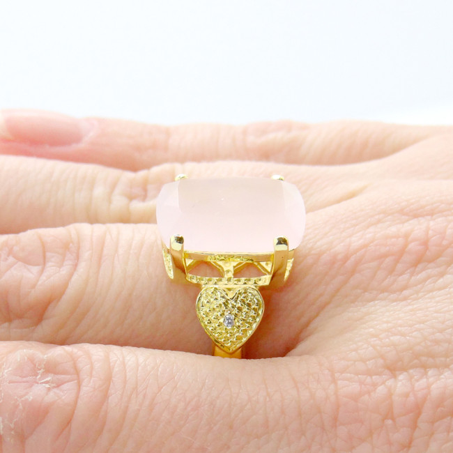 Anel com Diamantes e Quartzo Rosa, em Prata 925 Folheado a Ouro