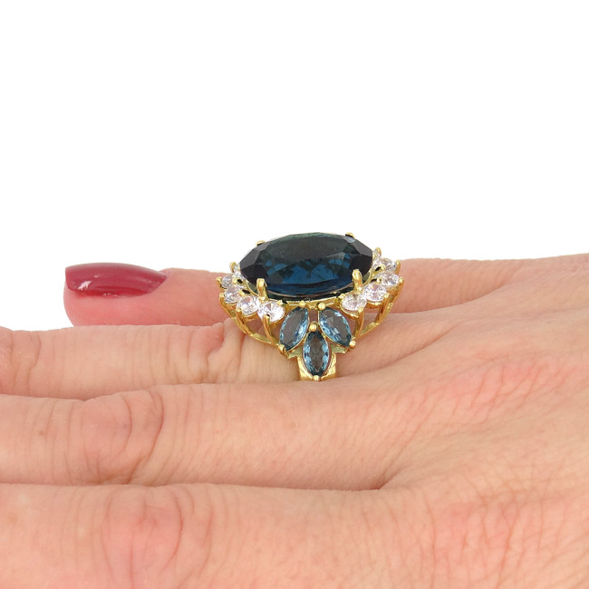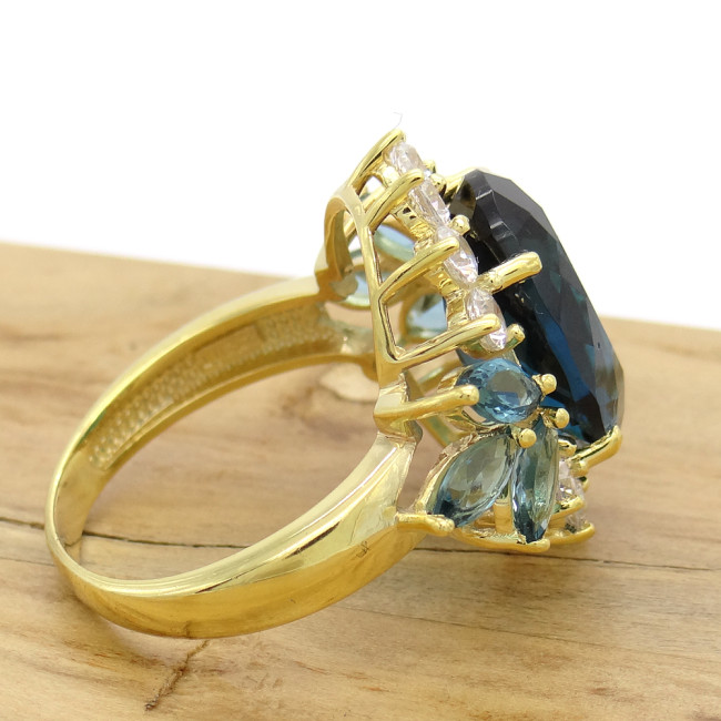 Anel com London Blue e Zircônias, em Prata 925 Folheado a Ouro