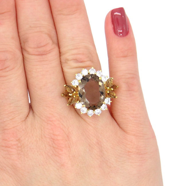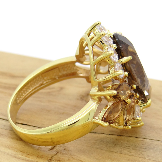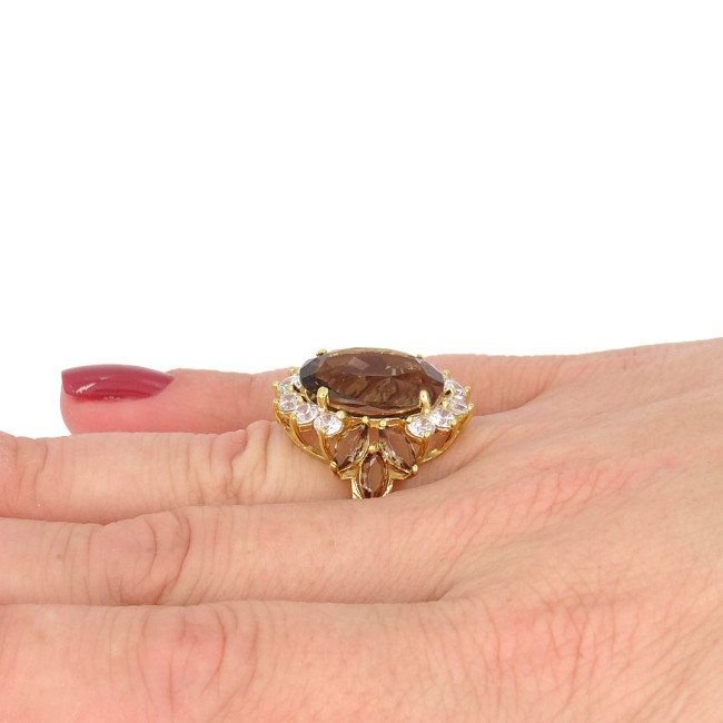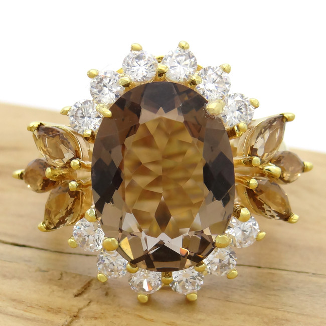 Anel com Quartzo Fume e Zircônias, em Prata 925 Folheado a Ouro