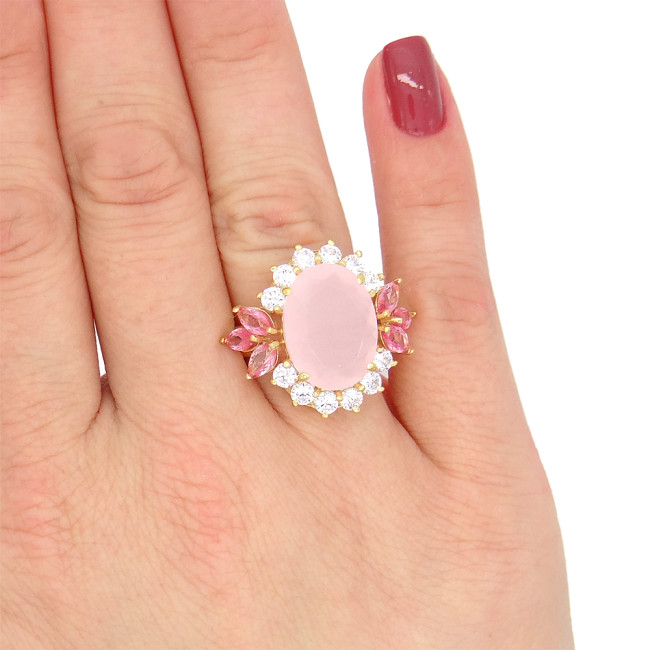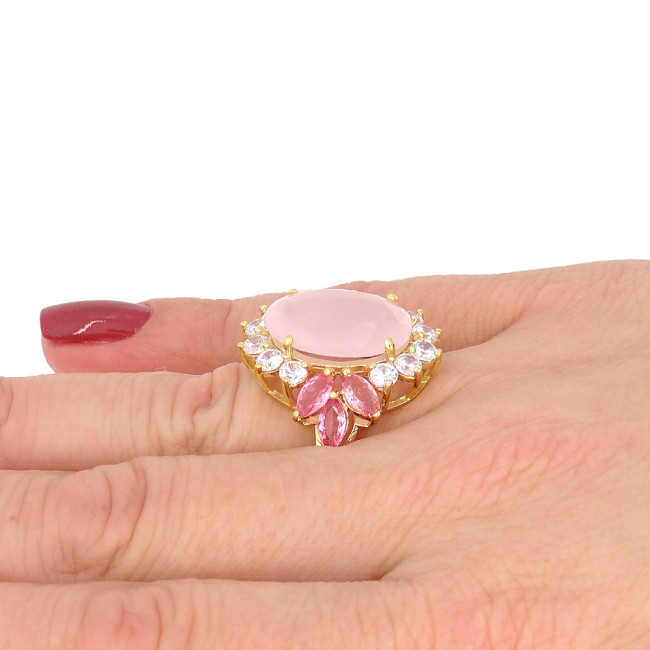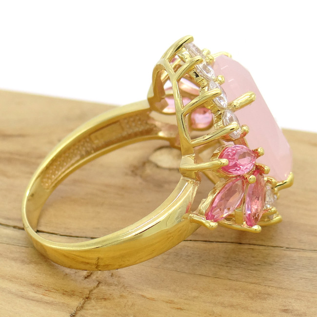 Anel com Quartzo Rosa, Rose de France e Zircônias, em Prata 925 Folheado a Ouro
