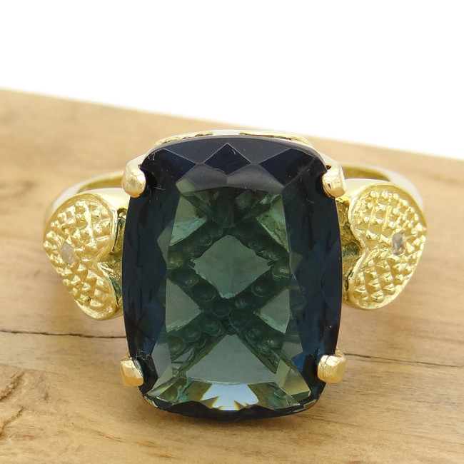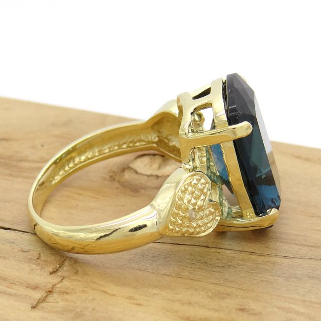 Anel Retangular com London Blue e 2 Diamantes, em Prata 925 Folheado a Ouro