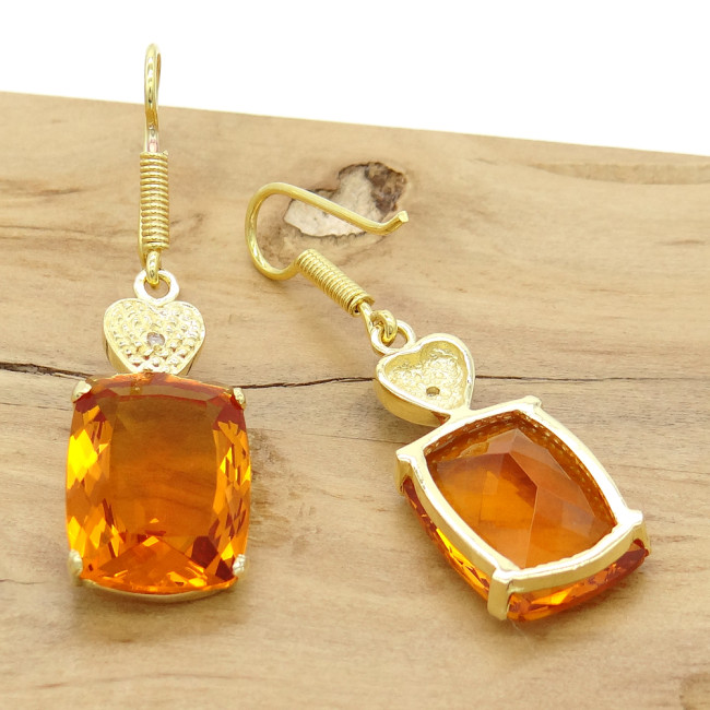 Par de Brincos com Diamante e Cristal Citrino, em Prata 925 Folheado a Ouro