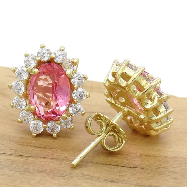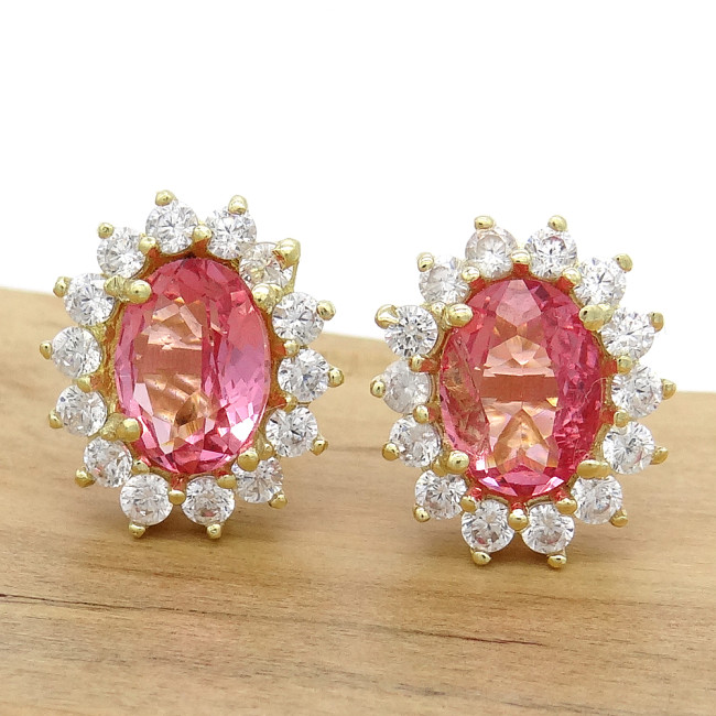 Par de Brincos Princess com 2 Cristais de Turmalina Rosa  e Zircônias, em Prata 925 Folheado a Ouro Amarelo 18 Kilates