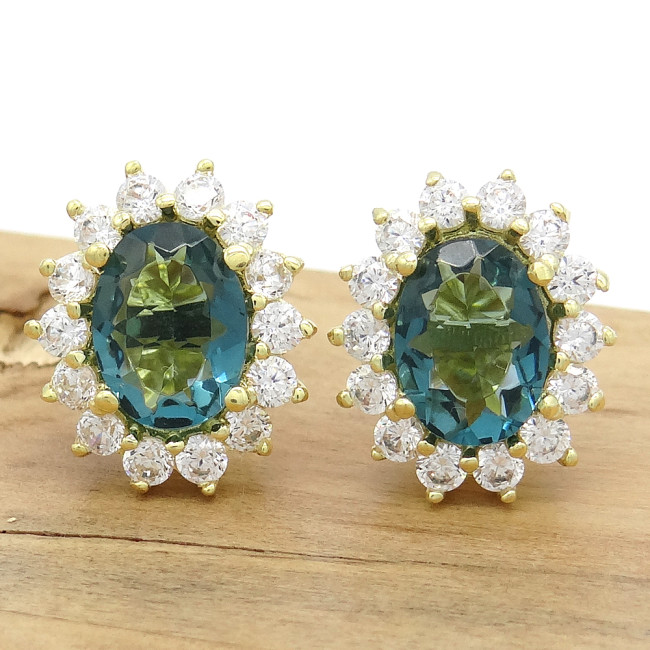 Par de Brincos Princess com 2 Quartzo Azul e Zircônias, em Prata 925 Folheado a Ouro Amarelo 18 Kilates