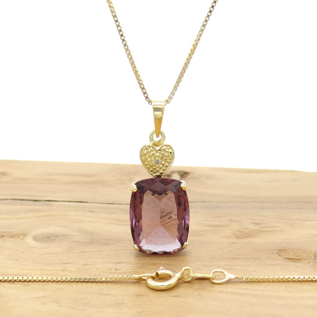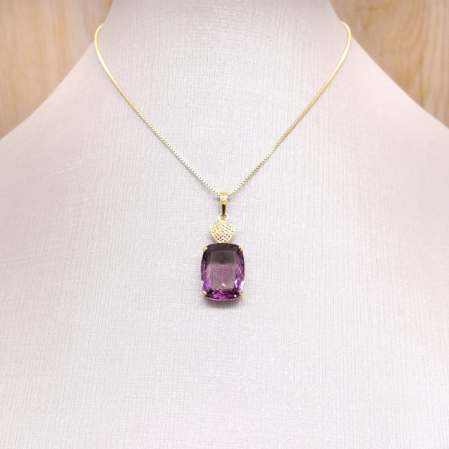Pingente com Diamante e Cristal Ametista, em Prata 925 Folheado a Ouro