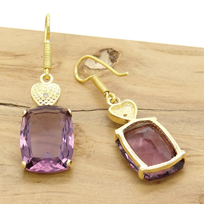 Par de Brincos com Diamante e Cristal Ametista, em Prata 925 Folheado a Ouro